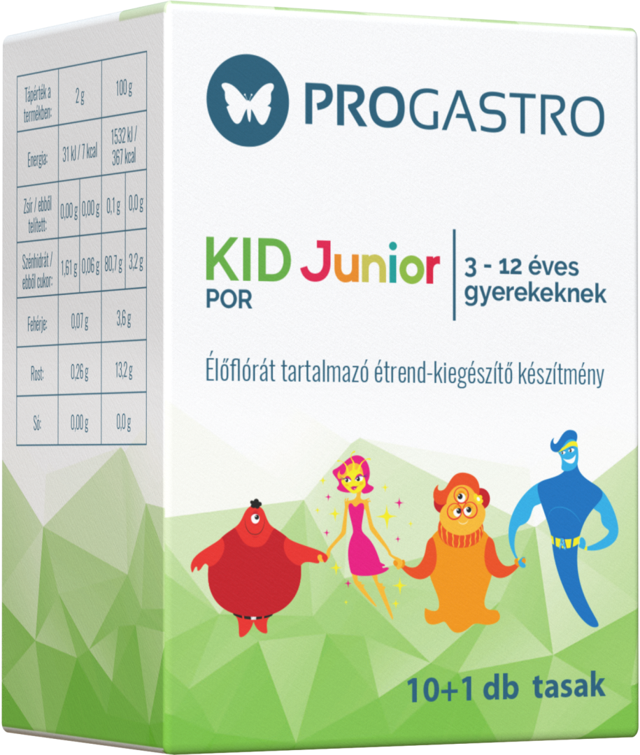 A ProGastro KID Junior 7 féle, a bélcsatorna mikroflórájában is megtalálható baktériumtörzset tartalmazó étrend-kiegészítő készítmény – kifejezetten gyerekeknek, 3 és 12 éves kor között.
